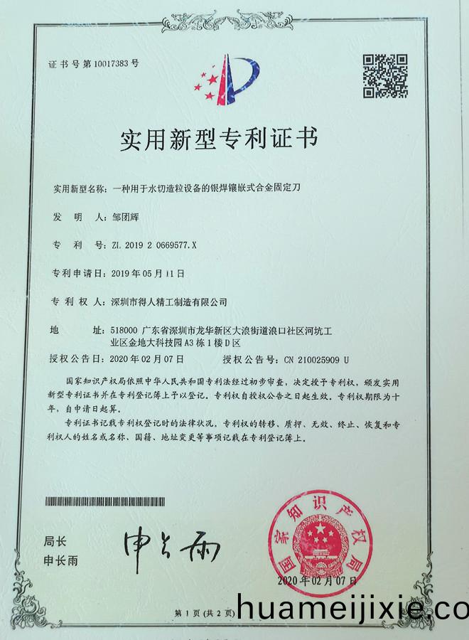 - 得(de)人(ren)精(jing)工郃(he)金(jin)固(gu)定(ding)刀(dao)專(zhuan)利(li)證(zheng)書