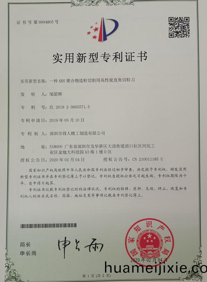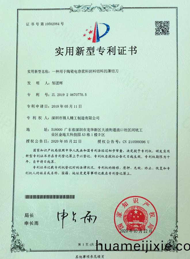 - 得人精工(gong)流(liu)延(yan)刀(dao)颳(gua)料刀(dao)專(zhuan)利(li)證書